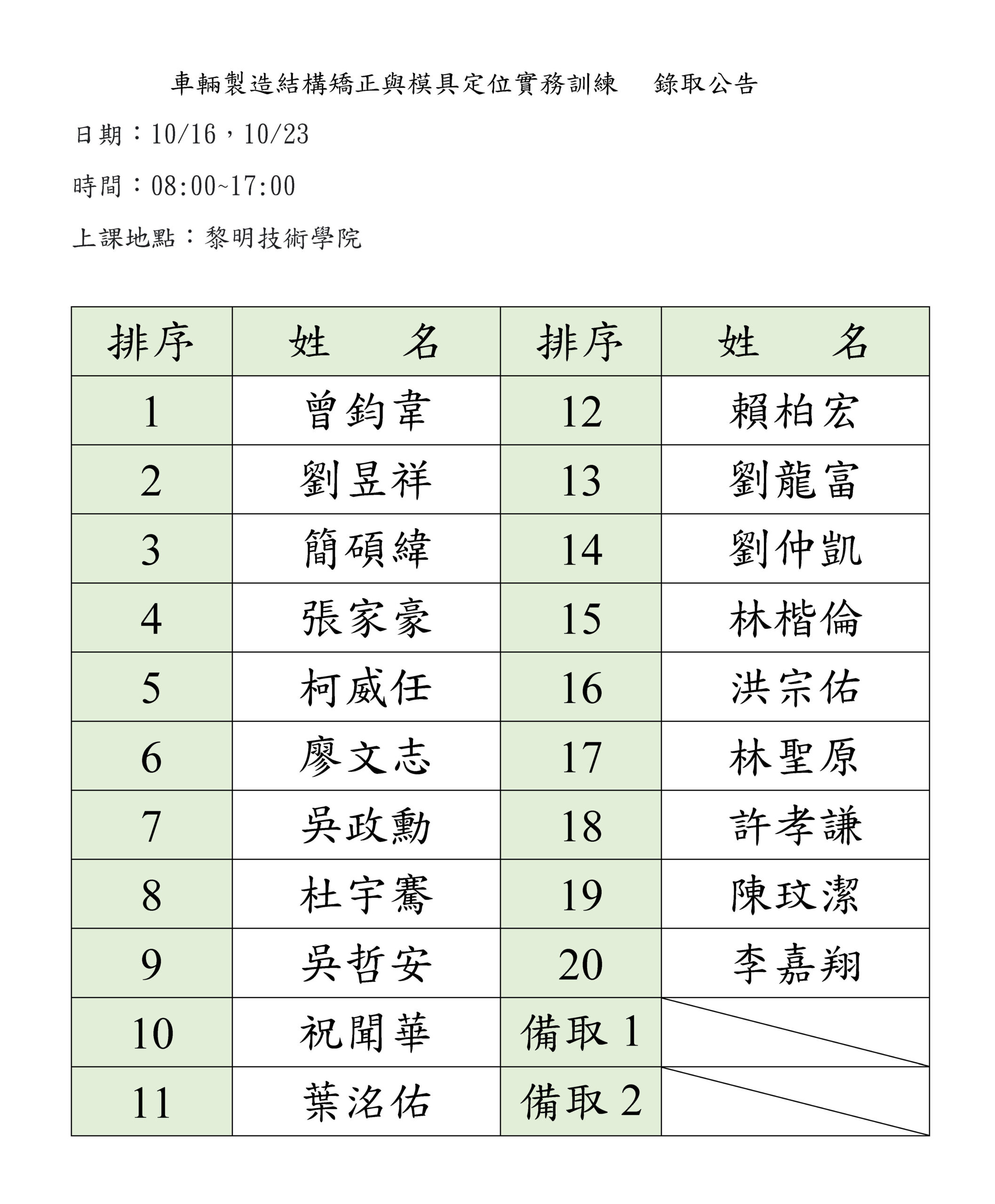 114年度車輛製造結構矯正與模具定位實務訓練 錄取公告